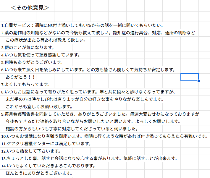 アンケートを通して、「看護師付き添いでの通院支援」「医師の話を一緒に聞いてもらいたい」などのご要望もいただいています。